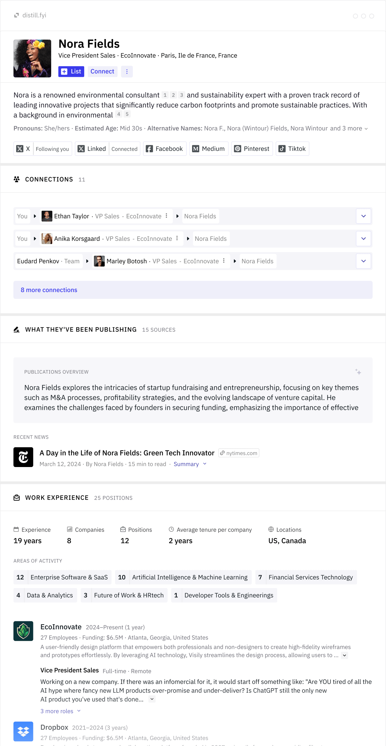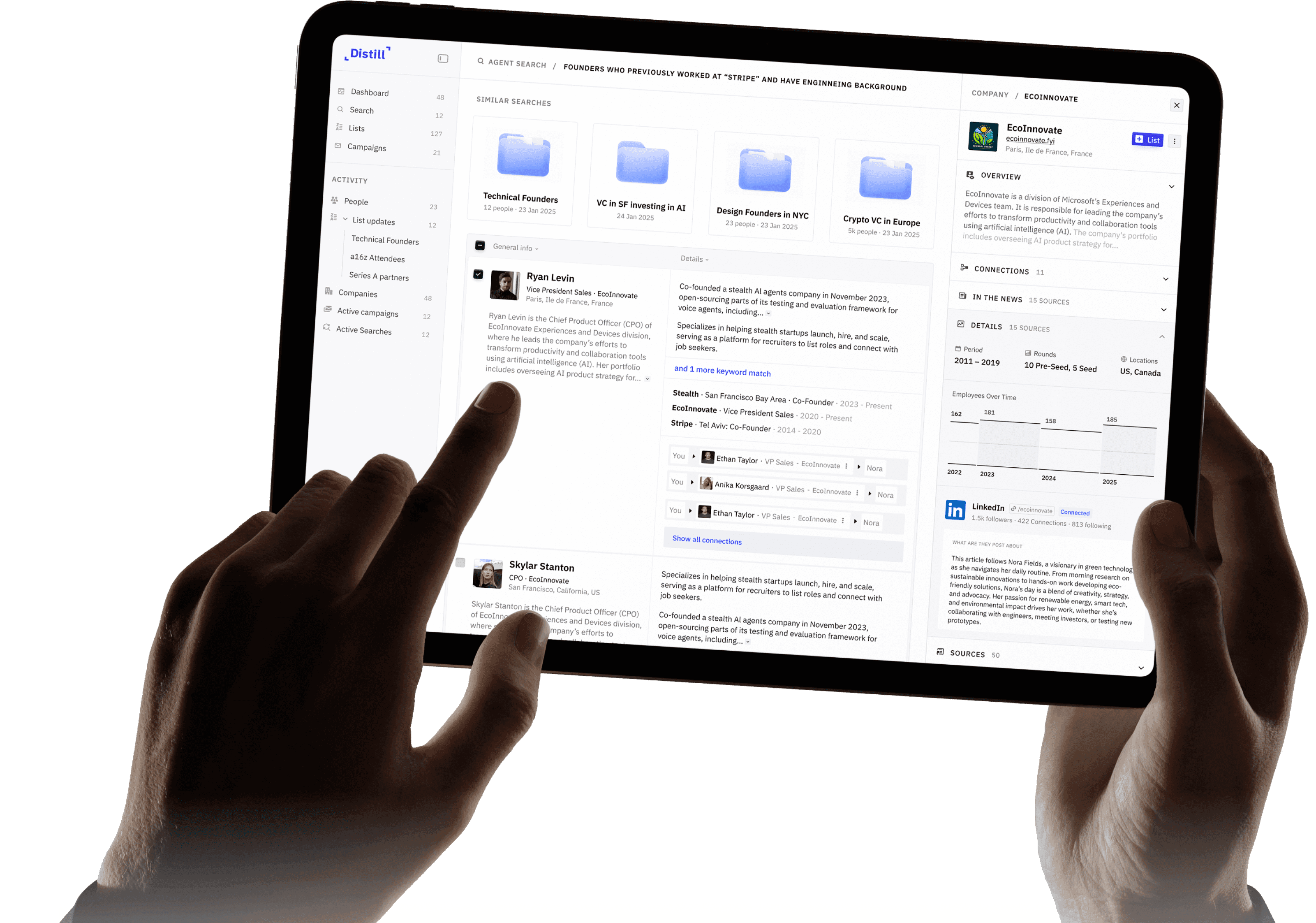 I partnered with the engineering team to design and ship core AI-driven features, including AI search, AI-generated people and company profiles, Gmail integrations, and outreach workflows. In parallel, I established the visual language and design system across product and marketing, and ran user research and usability testing to inform product decisions.