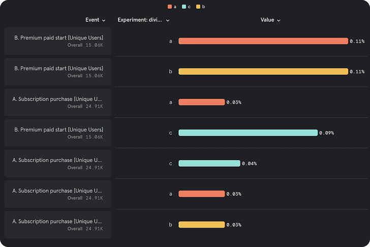 Example: We A/B tested a competitor comparison screen, which increased subscription purchases by ~2–5% (A).