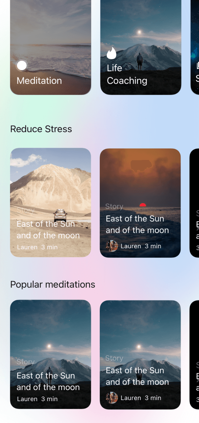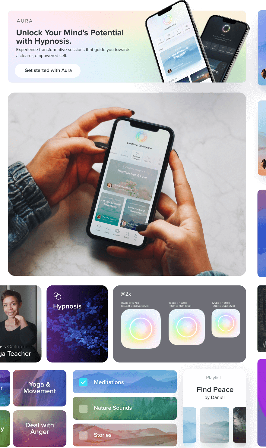 I joined the project as a freelance designer to assist with the app's branding and UI. The style featured bright gradients, images of nature, and a touch of glassmorphism ↓